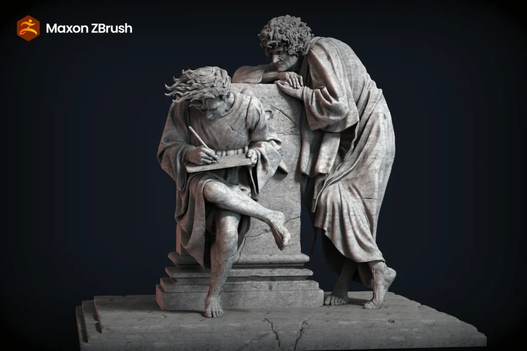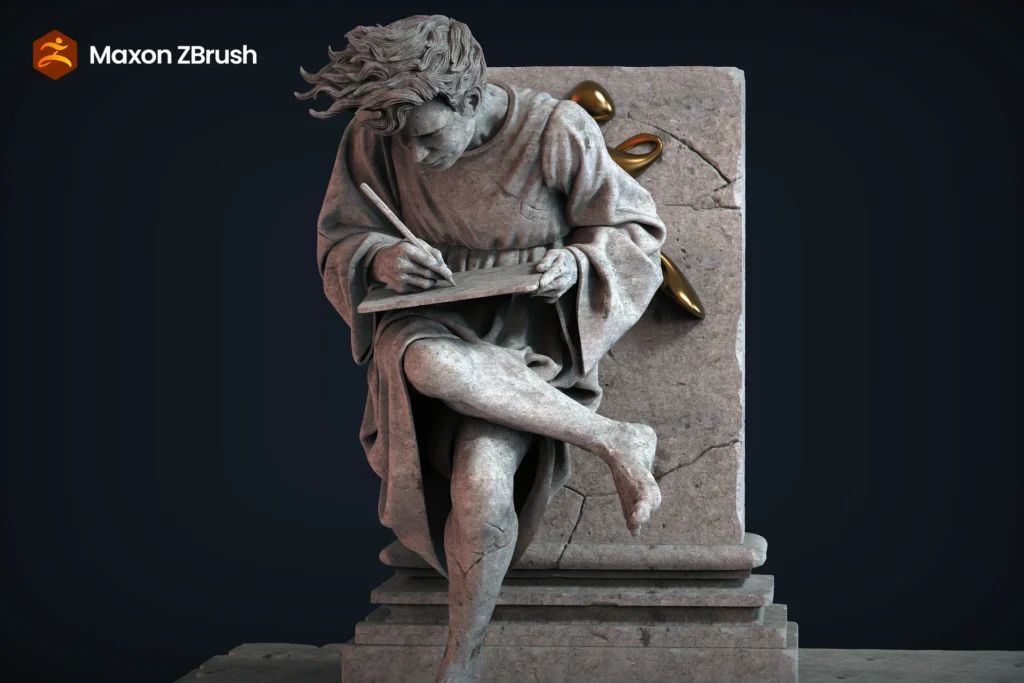 Digital sculpture developed in ZBrush Beta, inspired by a detail from Raphael’s The School of Athens , which I first discovered through the cover of Guns N’ Roses’ Use Your Illusion I album. The piece reinterprets the classical scene by depicting a contemporary modeler sculpting in ZBrush for iPad, establishing a dialogue between artistic tradition and digital technology. The work explores the aesthetics of carved stone, reinforcing the idea of continuity between the masters of the past and today’s digital creators. I began the blockout in ZBrush Beta for iPad and finalized it in ZBrush Beta for Windows. It was a very rewarding experience to migrate between both, continuing the project seamlessly across platforms, from PC to iPad
